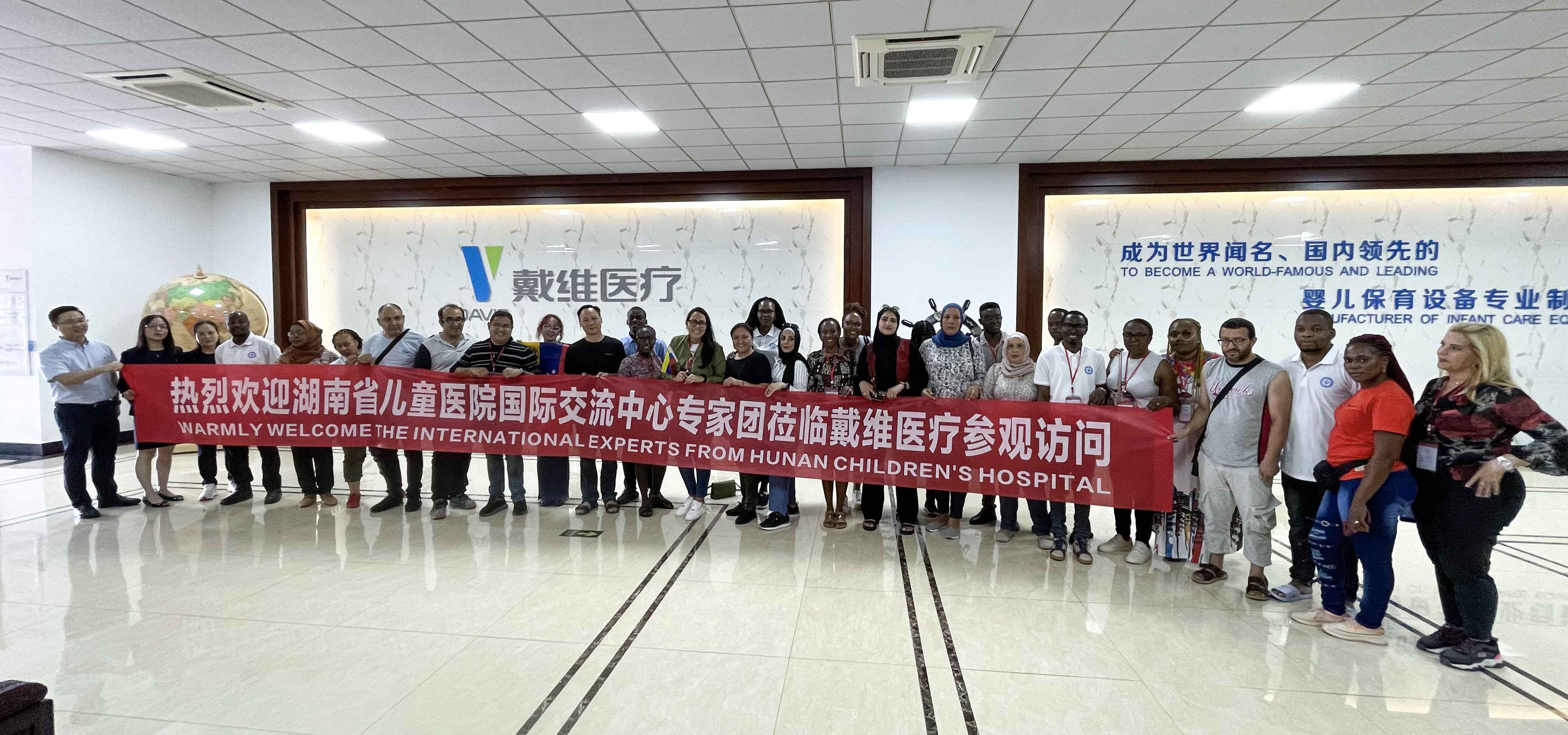 湖南省兒童醫院國際交流中心專家團一行由委內瑞拉、塞拉利昂、萊索托、博茨瓦納、阿爾及利亞、突尼斯、烏干達、坦桑尼亞、約旦等國家的相關醫生、專家組成,戴維醫療一眾高層領導攜公司成員對專家團表示熱烈的歡迎,并陪同參觀公司廠區,國際業務部相關負責人向專家團詳細介紹了企業的發展歷程、價值觀、經營理念、愿景等,從研發、管理、團隊、技術和生產應用等各方面對戴維醫療及子公司維爾凱迪的產品及綜合解決方案進行了全面的講解,為進一步合作奠定了堅實基礎。